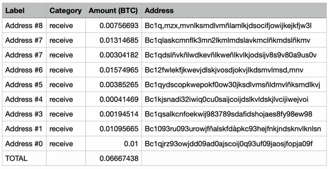 Aquí mas abajo, puedes ver un ejemplo de cómo se organizaría una wallet. Puedes ver las diferentes direcciones con fondos y el sumatorio total. Éstas son llamadas salidas de transacción no gastadas (UTXO).