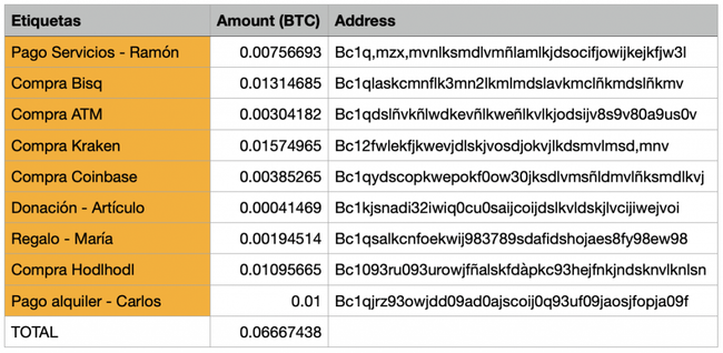 Después de entender cómo funciona una wallet para gestionar fondos es importante hablar del tema de las etiquetas. ¿Para qué sirven? Sirven para nombrar los UTXO/s, ya sea para saber quienes son los observadores, la procedencia, el precio en fiat en el momento que se hizo, etc. Consiste en incluir cualquier información para recordar de dónde provenían esos bitcoin que recibimos junto con otra información adicional si lo requiriésemos. Mas abajo te dejo un ejemplo de cómo se verían las etiquetas de cada UTXO: