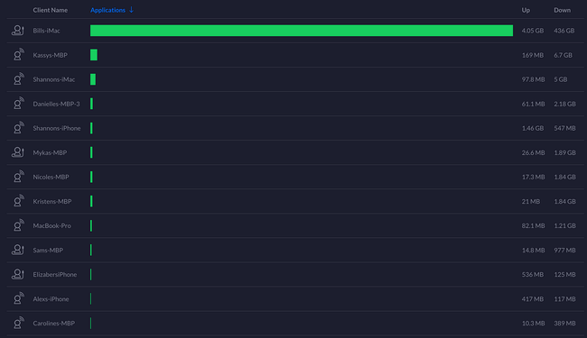 This amount of traffic is too large even for OS upgrades, so my first thought was that one of our employees was downloading and/or streaming 4K movies from iTunes while at work. Let’s see if we can dig into the by-client bandwidth stats and find the culprit…