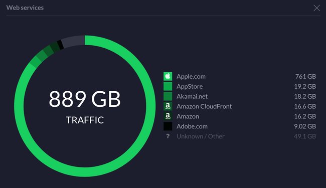 Nearly 90% of the ENTIRE TRAFFIC on my network was originating to/from Apple.com. Note that we are a fairly standard office environment, there is no reason we should have 761GB of traffic to ANYWHERE in just a few weeks time.