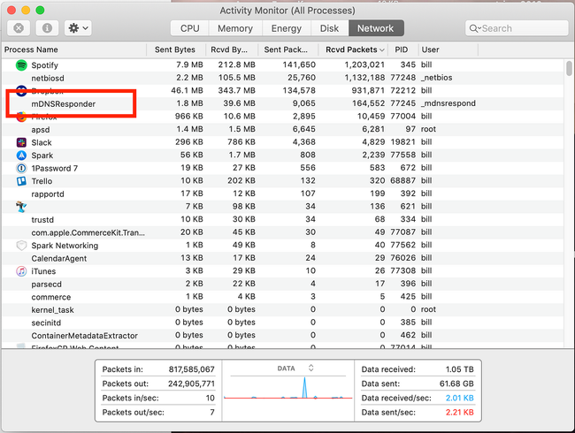 Wait…that’s MY MACHINE. My own iMac had downloaded 436GB from Apple.com. What the heck is going on? I opened up Activity Monitor on my machine to see if I could find the offending process (note: I had already fixed the issue before taking this screenshot, but the “mDNSResponder” process had nearly 600GB of traffic).