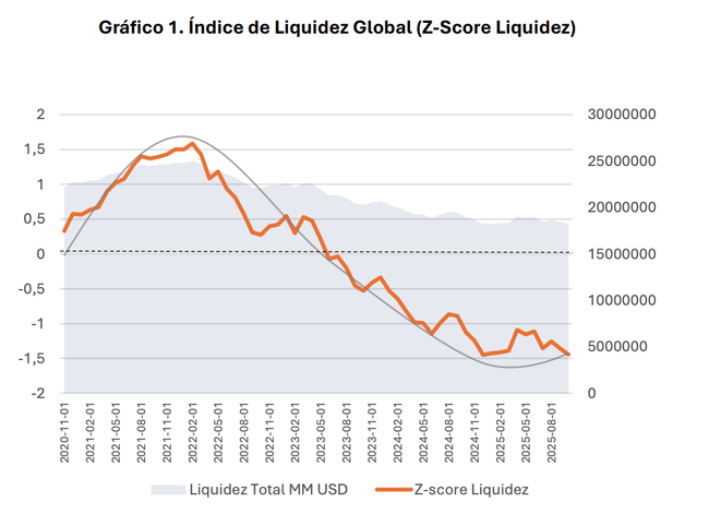 El Z-score de liquidez indica cuán extrema es la liquidez actual respecto a su promedio histórico, eliminando el crecimiento estructural. Valores positivos cercanos o superiores a +1.00 indican una expansión extrema de la liquidez. Valores cercanos a 0 señalan condiciones neutrales. Finalmente, valores negativos inferiores a -1.00 marcan una contracción severa de la liquidez.