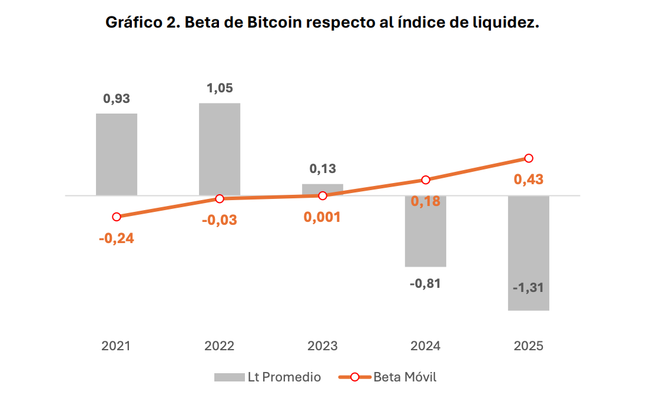 La beta móvil constituye así una medida del grado de integración de Bitcoin en el ciclo de liquidez internacional: