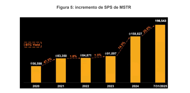Uno de los argumentos es que MSTR es una empresa operativa, no un mero gestor pasivo. MSTR utiliza su balance para apalancarse y emitir ciertos instrumentos que, a la larga, le permite obtener más bitcoin por unidad de acción emitida. Esto inspira a una de sus métricas más famosas como es SPS/BPS (Satoshis (1) per Share/Bitcoin per Share).