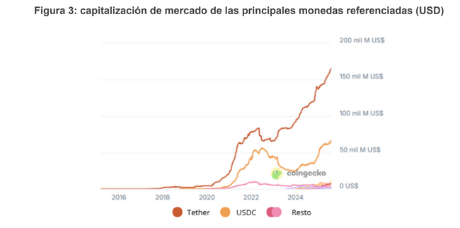 Tether es uno de los mayores tenedores de deuda pública estadounidense y una empresa tremendamente rentable más rentable (O’Donnell, 2024). Esto se debe a que brinda un servicio crucial para un gran número de personas, acceso a dólares en un entorno digital más allá de los EE. UU. y sin necesidad de emplear imperativamente las vías bancarias. Las stablecoins buscan intermediar los saltos entre la dimensión puramente digital y la infraestructura bancaria. Su ascenso, por tanto, es imparable, así se refleja en la figura 3.
