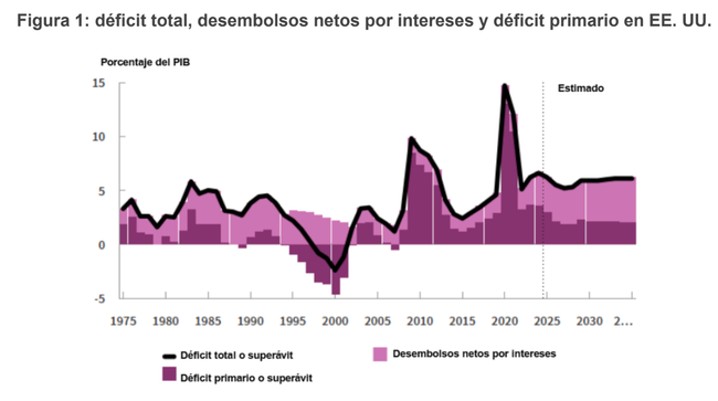 Como se puede observar a partir de la figura 1, el Estado estadounidense ha asumido tal cantidad de compromisos con sus ciudadanos, que su déficit fiscal va a mantenerse en niveles superiores al 5 % del PIB en el medio y posiblemente largo plazo, especialmente si tenemos en cuenta la reciente bajada de impuestos que difícilmente será compensada con recortes del gasto público ni recaudación arancelaria (McBride, 2025). A esto se ha de sumar la creciente emisión de deuda a corto plazo, que incrementa los costes de refinanciación apreciablemente en entornos de tipos de interés elevados.