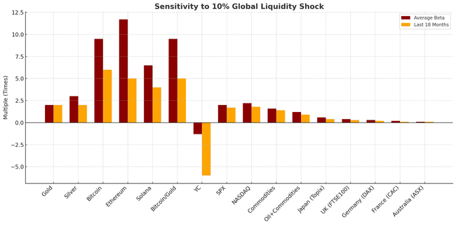 Esta alta sensibilidad explica por qué Bitcoin experimenta alzas más pronunciadas durante expansiones de liquidez, pero también es más vulnerable a caídas de liquidez en comparación con el oro. En el gráfico siguiente, un 10 significa que el activo normalmente se mueve un 10% por cada 10% de cambio en la liquidez (es decir, beta de 1.0).