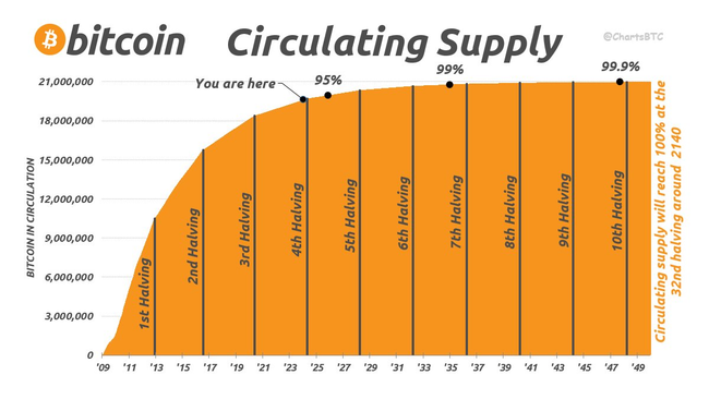 Dado que cada bloque minado proporciona una emisión de bitcoin a modo de recompensa y a su vez esa recompensa empezó a darse a partir de 50 bitcoins por bloque minado, se ha calculado que el número total de bitcoins en el número de años que se va a estar emitiendo (hasta 2140) dará 21 millones de bitcoins (210.000 bloques cada halving empezando por 50 bitcoins de recompensa, y dividiendo a la mitad la recompensa cada 210.000 bloques hasta 2140).