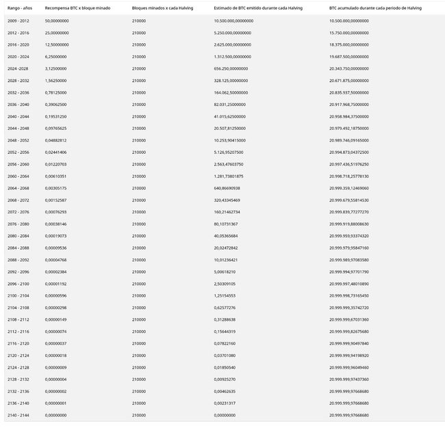 La siguiente tabla tiene como objetivo mostrar la emisión de bitcoin que se dará a lo largo de los años y tratar de dejar claro el modelo de escasez, emisión y tiempo que rigen al modelo de generación de «monedas» de Bitcoin, todo gira entorno a tiempos perfectamente establecidos, bloques emitidos y consenso completado.