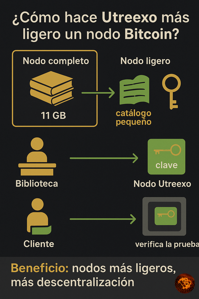 La idea de Utreexo es trasladar parte de esa carga a los propietarios de las monedas: cada vez que gastas bitcoin, aportas junto con tu transacción una pequeña prueba que demuestra que esa moneda es válida. Metáfora rápida: hoy, para verificar un pago, tu nodo debe cargar en casa un enorme libro de contabilidad con millones de páginas, cada una detallando cada moneda de Bitcoin. Con Utreexo, todo se simplifica: solo necesitas un pequeño sello de autenticidad que viaja con la moneda cuando la gastas. Tu nodo verifica ese sello contra un catálogo compacto y público, como un índice diminuto, sin hojear el libro entero.