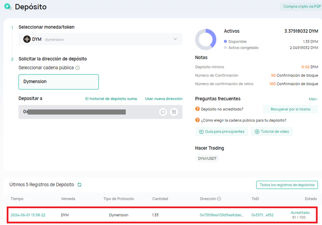 Confirma el depósito en CoinEx: Una vez que la transacción se haya confirmado, los fondos aparecerán en tu cuenta de CoinEx en la sección "Activos".