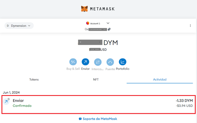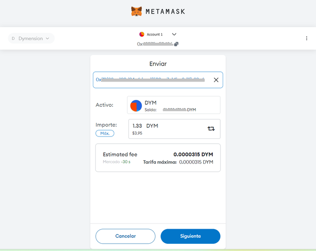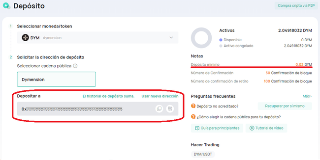 Con esta información, tenemos claro que tenemos que enviar los tokens desde la red de Dymension, a la dirección que nos aparece. También nos indica que el Depósito mínimo es de 0.02 tokens.