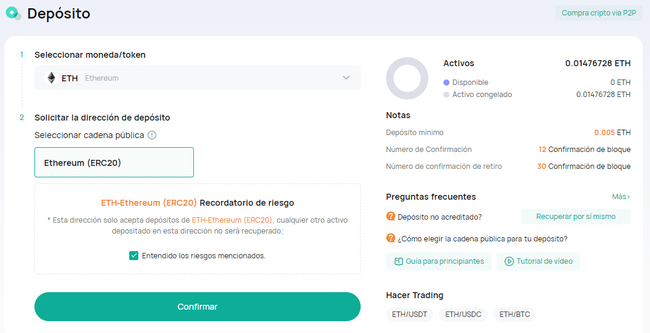 En este caso, CoinEx sólo permite depositar ETH a través de la red de Ethereum y el depósito mínimo es de 0.005 (en caso de enviar menos criptomonedas se pierden)