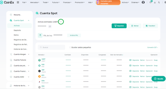 Para acceder al mercado, tendremos que acceder a la cuenta de CoinEx, pulsamos sobre "Activos" y "Cuenta Spot".