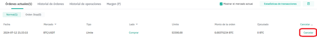 En caso de que se quiera cancelar la orden no ejecutada, podremos pulsar sobre "Cancelar" y la orden será eliminada.