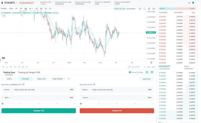 En este punto, podremos realizar una orden limite o de mercado para comprar/vender ETH con respecto a BTC. Es decir, si tenemos ETH, podríamos vender ETH directamente por BTC sin tener que pasar por una moneda estable (USDT, USDC)