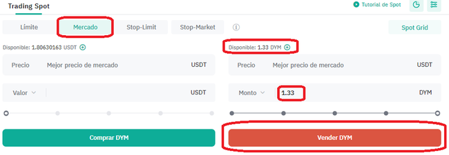 En este caso, queremos vender los tokens de DYM por USDT. Podemos realizar una orden límite o una orden de mercado.
