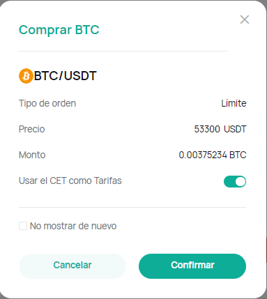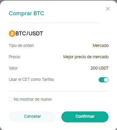 Si tienes en tus activos criptomonedas CET(CoinEXToken), se recomienda activar el selector de usar CET como Tarifas, porque pagarás menos de comisiones.