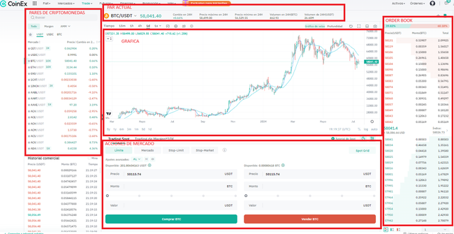 Al acceder al mercado Spot y seleccionar el par BTC/USDT, nos mostrará los distintos pares de criptomonedas, una gráfica, el order book y las distintas acciones que podemos realizar.