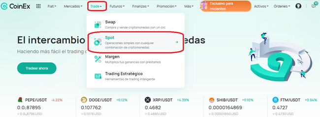 Para acceder al mercado de Spot, tendremos que pulsar sobre "Trade" en el menú superior y seleccionar "Spot"