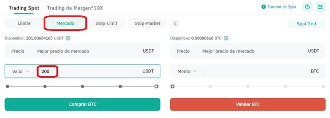 Compra BTC al precio de mercado actual. Es la forma más rápida de realizar una compra. Pero no te asegura que compres toda la cantidad de criptomonedas al precio actual, ya que empezará a tomar ordenes del "Order Book" hasta completar el valor de USDT(o de la moneda con la que vayas a realizar el intercambio).