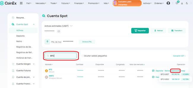 Si tenemos USDT en nuestra cuenta de CoinEx, la opción más sencilla para hacer el intercambio es, desde la vista de Activos de la Cuenta Spot, buscar BTC y, en la fila de BTC(bitcoin), pulsar sobre "Operación" y elegir el par de monedas con el que queramos hacer el intercambio.
