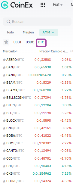 En la ventana de mercado de Spot, en el buscador de pares de criptomonedas, tendremos que seleccionar BTC en el selector principal de pares.