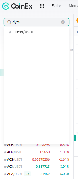 Para ello, vamos a buscar un par de criptomonedas en el buscador del mercado spot. Por ejemplo, el par DYM/USDT y lo seleccionamos.
