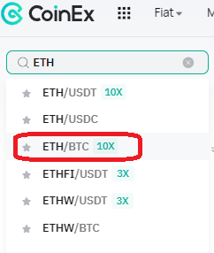 Una vez tenemos seleccionado BTC, buscamos la criptomoneda con la que queremos hacer el intercambio. Por ejemplo ETH/BTC