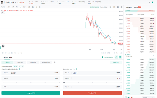 Al seleccionarlo, nos aparecerá el gráfico del par DYM/USDT, las ordenes del Order Book y las acciones de mercado que podemos ejecutar sobre este par.