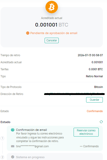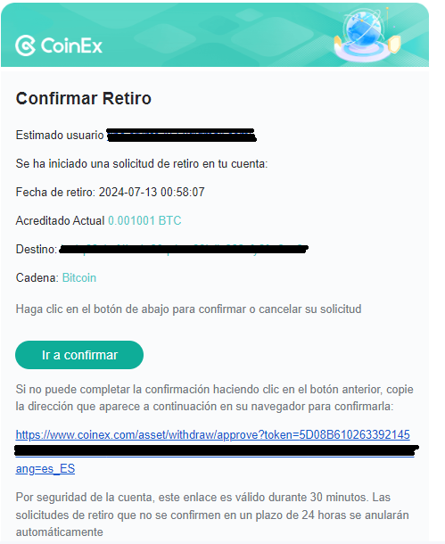 Una vez introducido los digitos válidos y pulsando en "Confirmar", nos enviará a otra página con los datos de retiro y habría que volver a aprobar el retiro desde un correo electrónico que nos han enviado.