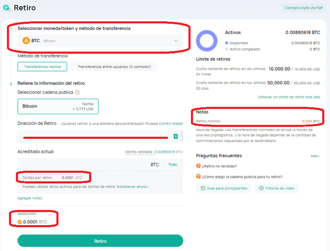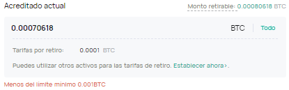 Retiro mínimo: Es la cantidad mínima que puedes enviar en cada retirada. En este momento es 0.001 BTC si intentas enviar menos, te mostrará un mensaje de error.